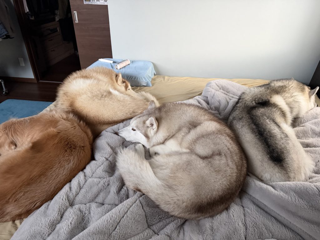 お昼ごはんはラーメン屋さんに行きましたが混んで並びました🍜本日寝る前はハスキーは群れてます🐶朝だ☀️そろそろ起きるぞー😊