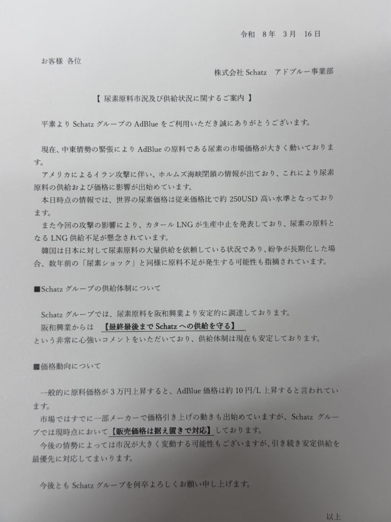 2026.03.17 社長のアソビ日記 いつもお世話になっております。中東情勢の影響でアドブルー原料の供給が不安定になる可能性があります。弊社はすでに在庫の積み増し調達先の伏線化出荷優先順位を実施しており供給が逼迫した場合でも止めない体制で対応いたします。ご不明点や急ぎのご相談があれば遠慮なくご連絡ください。今後ともよろしくお願いいたします🙇♂️ ⼀覧へ戻る